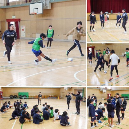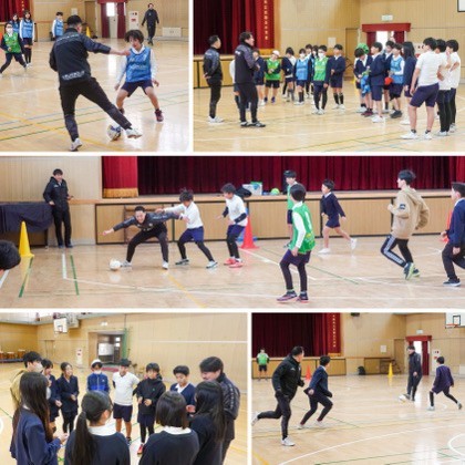 アイスブレイクで緊張をほぐした後は、いよいよ実技指導。ドリブルやパスの基礎、空間の使い方などを、実演を交えながら分かりやすく教えていただきました。子ども同士のミニゲームでは、コーチや選手、先生も加わり、大いに盛り上がりました。