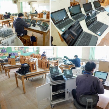 図工室に搬入された200台以上の新しい端末。業者の方が、1台1台ていねいに設定作業を進めていました。
