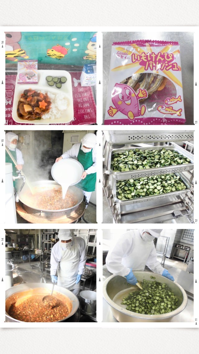 献立は、ハヤシライス・きゅうりのバジル風味サラダ・いもけんぴフィッシュ・牛乳でした。