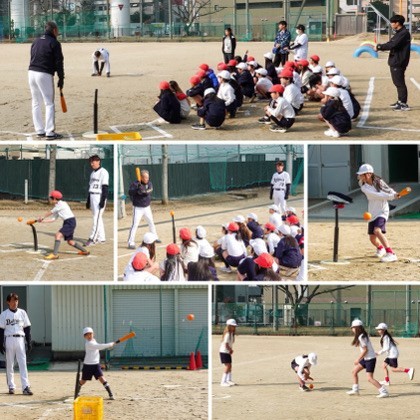 4年生を対象に、「出前Tボール教室」が行われました。今回は、プロ野球チーム オリックス・バファローズのOB選手である、塩崎真さんと吉田直喜さんのお二人が来校し、子どもたちに直接指導してくださいました。