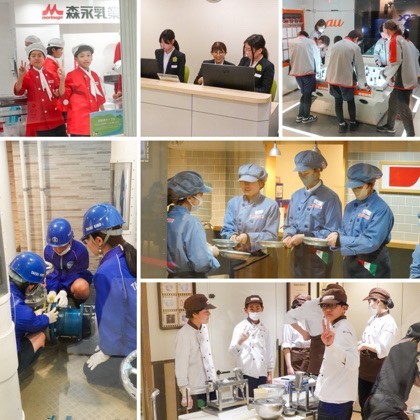 さまざまな職業体験に取り組む6年生。ユニフォームに身を包み、本物さながらの設備の中で活動することで、「働くこと」の楽しさや責任、仲間と協力する大切さを学ぶ機会となりました。