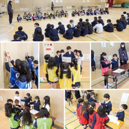 3,4時間目、講堂で「おもちゃまつり」を行いました。2年生が手作りおもちゃを用意し、お店を運営しました。1年生はお客さんとして参加し、さまざまなおもちゃ遊びを楽しみました。