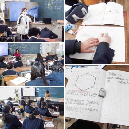 正六角形と、その正六角形がすっぽり入る円に注目し、それぞれの周囲の長さを求めながら学習を進めました。プレゼンテーションを用いた説明は視覚的にもとても分かりやすく、子どもたちは「円のまわりの長さは直径の3倍より少し長い」ということを、実感を伴って理解していました。