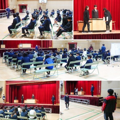 この時間は、式全体の流れを確認するとともに、卒業証書授与の際の動きについて練習しました。名前を呼ばれたら、しっかりと返事をし、一人一人が決意表明を行います。少し緊張した様子も見られました。