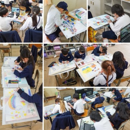 この作品袋には、1年間の図工の時間に制作した絵画等を入れて持ち帰ります。子どもたちの成長と努力と思い出がたくさん詰まった、大切な宝物です。