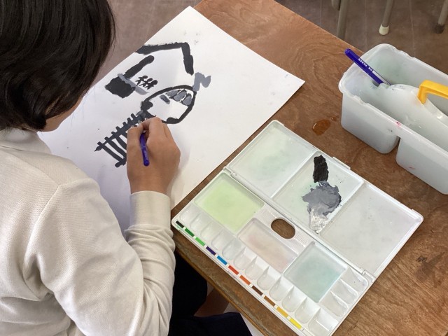 4年生の図工では、絵の具の「色の濃淡」や「似ている色の組み合わせ」を活かした絵画に取り組んでいます。同じ「赤」や「黒」でも、水の量を変えたり、少しずつ他の色を混ぜたりすることで、驚くほど表情が変わります。パレットの上でじっくりと色を作り、筆先に集中して画用紙に向かう子どもたち。自分だけの色、自分だけの世界が、真っ白な画用紙の上にいきいきと広がっています。