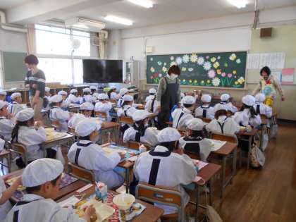 6年生たちが給食の準備をしたことがない1年生たちのお手伝いを手際よくしてくれたので、とても早く給食を食べ始めることができました。