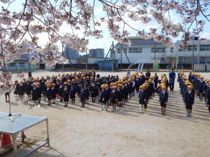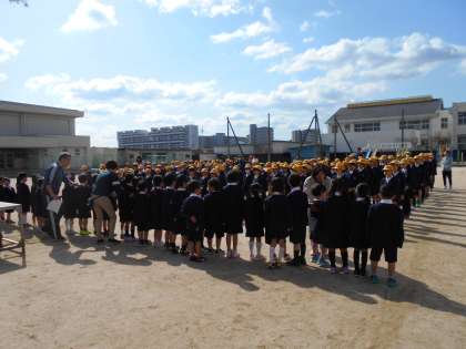 朝礼台の前に立った1年生は少し緊張気味でしたが、昨日教室で練習したあいさつを声をあわせて言うことができました。