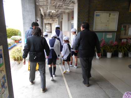 給食を取りに行くときにも、校長先生をはじめいろんな人に見守られています。