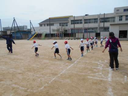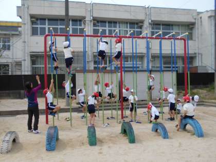 先生の動きのまねをしたり、線の上を小走りしたり、上り棒に上ったり…