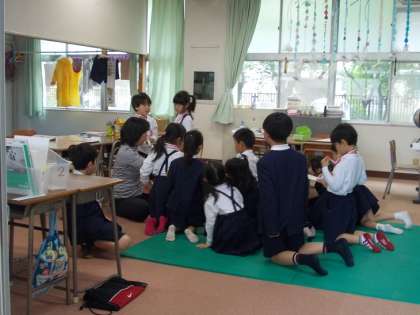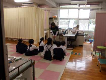 2年生が1年生を連れ、学校の特別教室を案内しました。