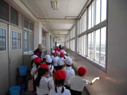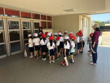 教室から2列に並んで移動。体育館前ではシューズの置き方などの簡単な説明を聞いています。