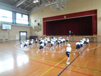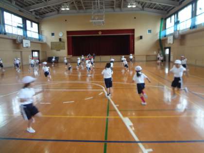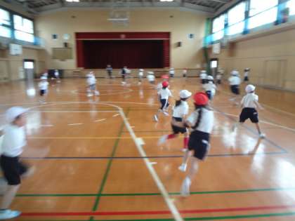 子どもたちが歓声を上げながら体育館の中を走り回っています。