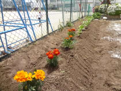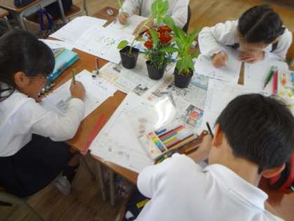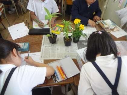 教室でマリーゴールドとホウセンカの苗を観察してスケッチしました。