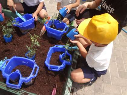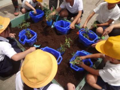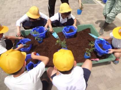 管理作業員さんをはじめ、いろんな先生に手伝ってもらいながら、栄養たっぷりの土を使って植木鉢に植えることができました。