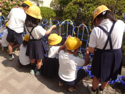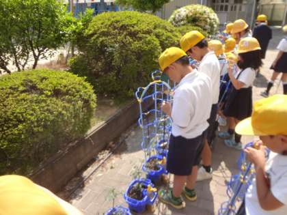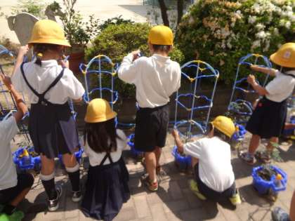 先週に植えたプチトマトの植木鉢に支柱をつけました。