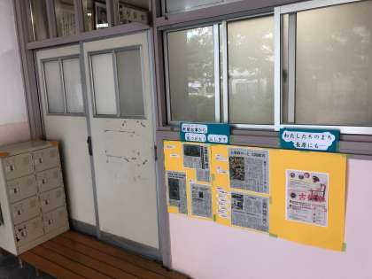 校長室の前には古墳や世界遺産の新聞記事が掲示されています。