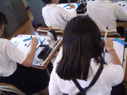 一画一画の書き方、それぞれの位置や文字全体のバランスの説明を聞いた後、筆に墨をつけて書き始めました。