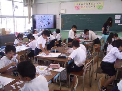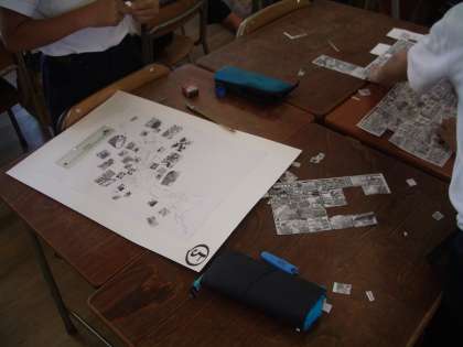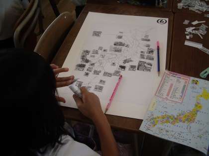 スーパーのチラシのコピーを切り抜き、日本地図にはりつけています。
