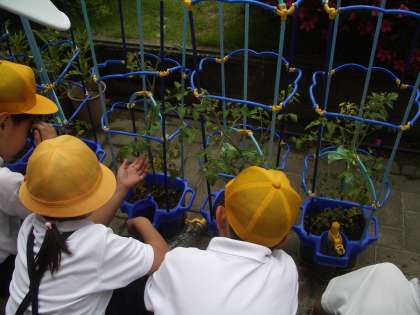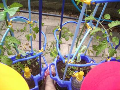 先日植えたプチトマトの観察をしました。小さな実もできてきました。