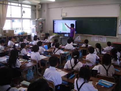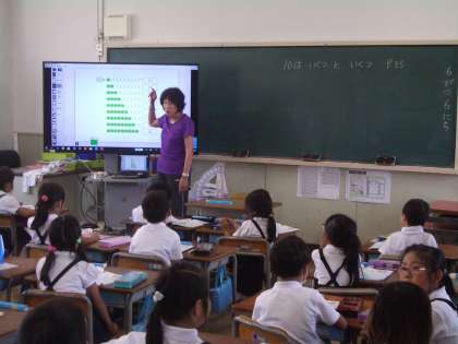 10の数を分けると“いくつといくつ”になるかを大型テレビを見ながら考えています。