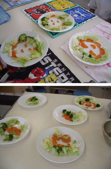 キャベツ・にんじん・ブロッコリーをきれいに水洗いし、包丁で適当な大きさに切ってゆでました。各自きれいにお皿に盛りつけをしました。