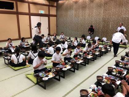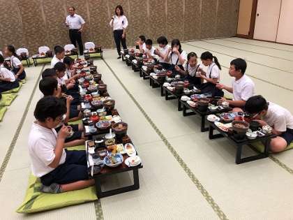 友と語り合いながら、目の前に並んだごちそうを夢中で食べています。