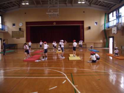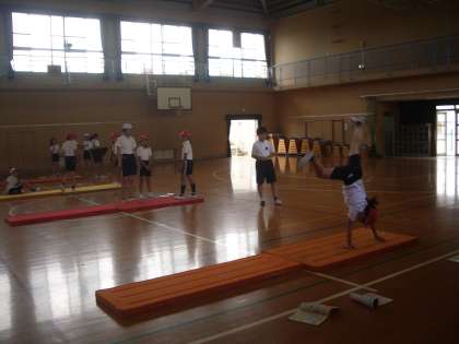 6年生は体育館でマット運動をしています。