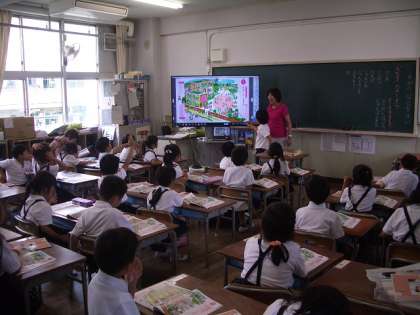 教科書の挿絵を見ながら、きまりを守らない動物を探しています。