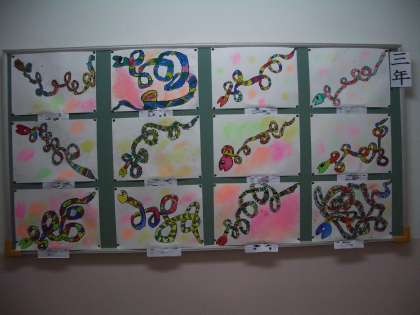 6月14日(金) 3年の階段掲示は、「カラフルなへび」です。