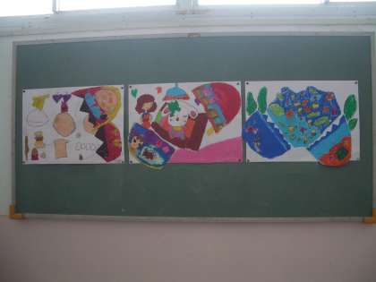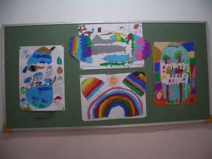 2年生の階段掲示は、図工作品“ひみつのたまご”です。