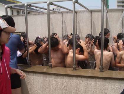 プール開きにふさわしいとてもよい天気でしたが、子どもたちは冷たいシャワーの水に驚きの声をあげていました。