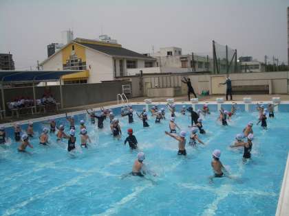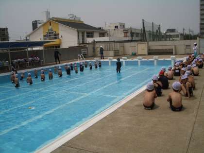 1年生は小学校のプールが初めてということもあり、中・高学年に比べて水位をかなり低くしました。2年生がとても良いお手本を見せてくれました。