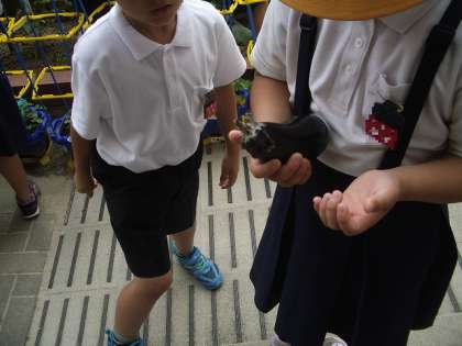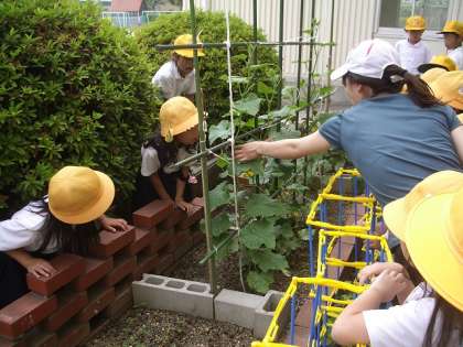 今日はナスを収穫し、隣に植わっているキュウリの赤ちゃんを観察しました。