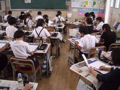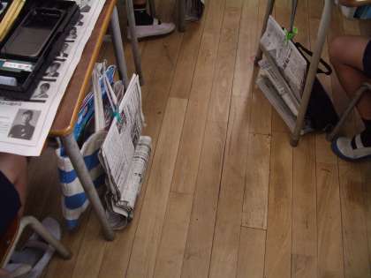 書いた作品は汚れないように新聞紙にはさみ、机の横につっています。