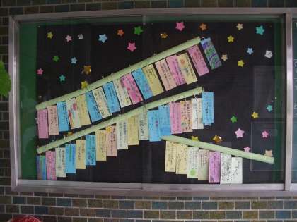 7月の玄関掲示は、6年生とわかたけが交流の際に作った七夕飾りです。