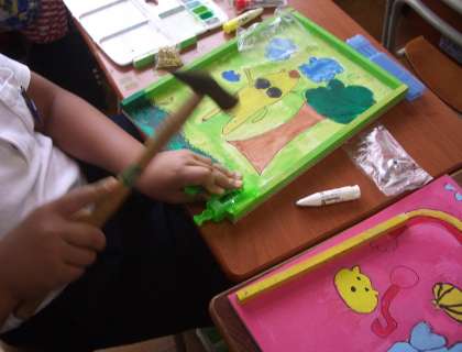 絵を描けた児童から、釘を打ち付けていきました。