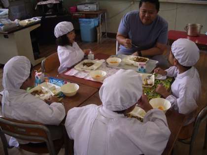 ALTのケルビン先生といっしょに給食を食べることができ、2年生の子どもたちは大喜びです。いろんなことを質問しています。