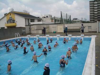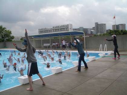 1・2年生がプール入水後すぐに始めるのが、“テクノダック体操”です。