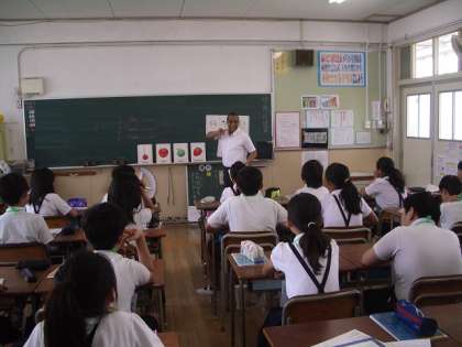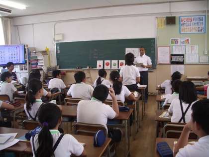 「何のカードか?」子どもたちに尋ね、ラワット先生がいろいろとヒントを与えながら英語で答えさせています。
