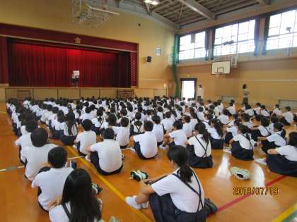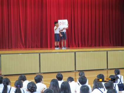 99パーセントの児童が“あいさつしている”と回答していることや、特にがんばっていた学年の発表がありました