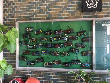 8月21日(水) 玄関掲示が“焼き板工作”になりました。 5年生が林間学習で作ったものです。