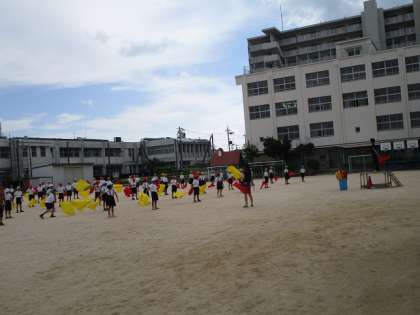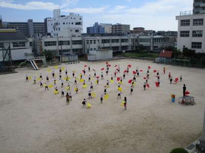 運動会団体演技の隊形に並び、フラッグを振って“風を切る音”を確かめていました。