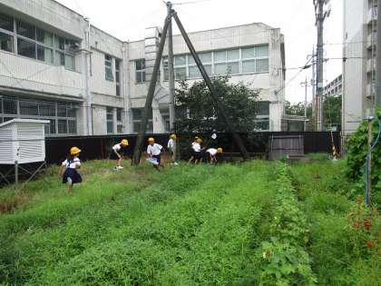 理科の授業で観察するため、子どもたちが長原ガーデンで昆虫探しをしました。