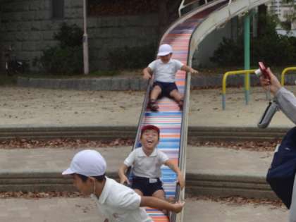大阪城には外国の観光客や遠足で来ている人たちがたくさんいました。ピカピカの大阪城の前で写真を撮ったり、林でドングリや松ぼっくりを拾ったりしました。また、お弁当を食べた後は、遊具のある公園で遊びました。みんなとても仲よく遊んでいました。