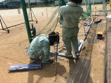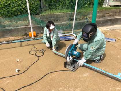 サッカーのゴールが経年劣化してきたため、本校の管理作業員が溶接等をしながら修理しています。