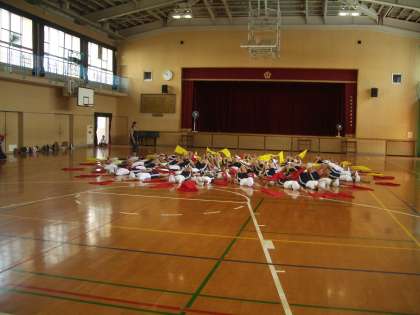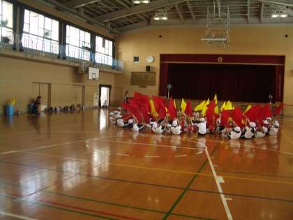 フラッグを上げ下げするタイミングを全員で合わせるために、何度も練習を繰り返します。