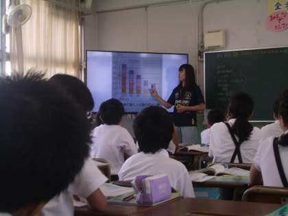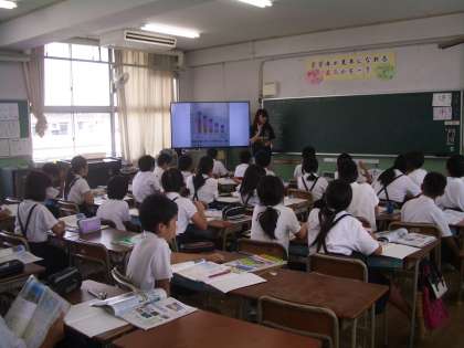 5年生の社会では、漁業に携わる人口の変化について棒グラフから読み取り考えています。
