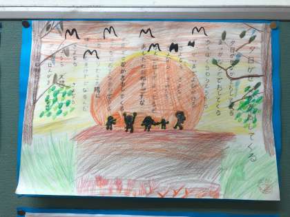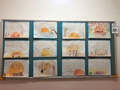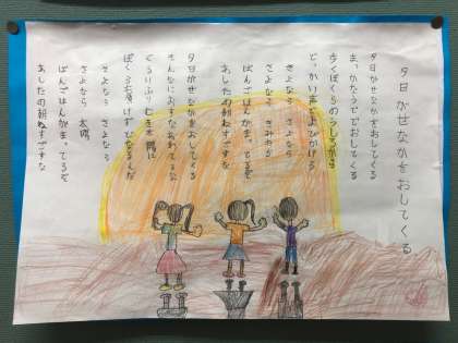 3年の階段掲示は、詩“夕日が背中を押してくる”の視写と絵です。