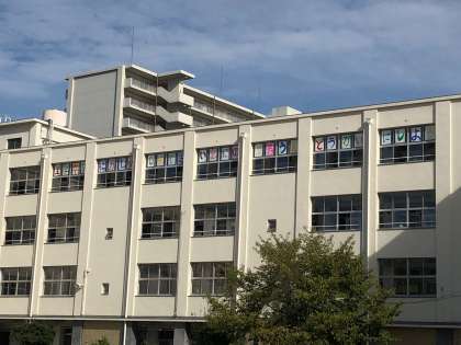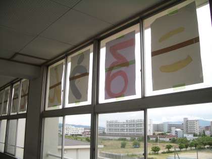 今年の運動会のスローガンは「全学年が協力し楽しめて思い出に残る運動会にしよう」です。運動場からよく見えるように、校舎4階の窓に一文字ずつ貼りつけています。